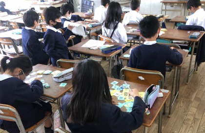 3年4組の教室です。この時間、保健室で聴力検査をし終えて、順に教室に戻ってきた子どもたちが、地図の記号のカードを机に広げていました。