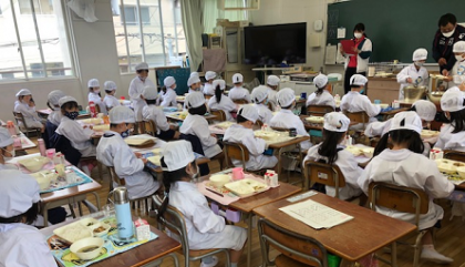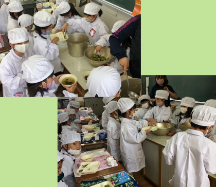 一生懸命給食の準備に取り組んでいる1年生。少しは慣れてきたでしょうか。