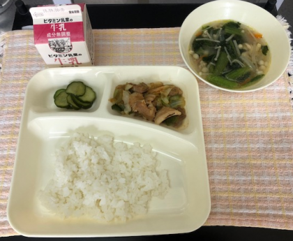 今日の献立は、ホイコーロー、中華スープ、きゅうりのピリ辛あえ、ごはん、牛乳です。