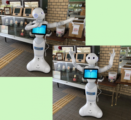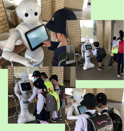 毎朝、学校の玄関では、ペッパーさんが子どもたちを出迎えています。