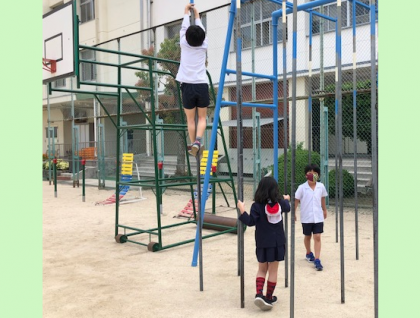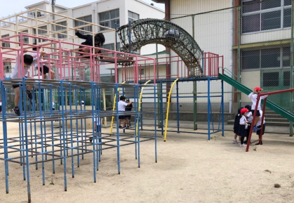 鉄棒で得意の前回りをする子、登り棒のてっぺんまで行ってみせてくれる子、総合遊具のジャングルジムを友達と一緒に登っていく子。