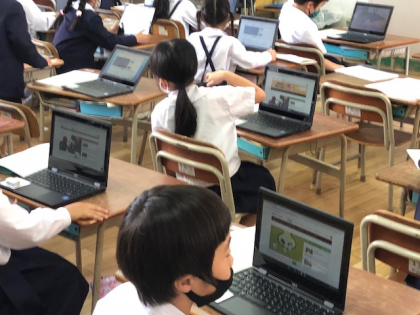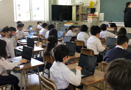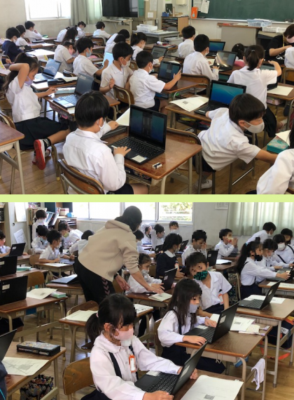 3、4時間目。2年生の教室では、学習者用端末機を前に、子どもたちが真剣な表情をしています。