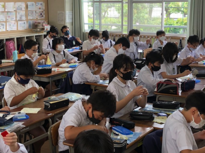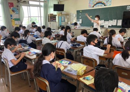 5年4組は、家庭科の時間です。子どもたちは机の上に、針に糸、運針用布を出していきます。裁縫を楽しみたいと思わせるような、子どもたちのかっこいい裁縫道具に目が行きます。