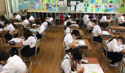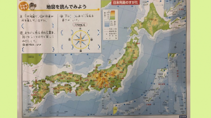日本地図の読み取り方や大阪府の地形に関する問題です。しっかり取り組んでいた子どもたちは、早々と裏表あるテストをやり終え、終わった子から、小テストを始めました。大阪府の平野や山地、丘陵など、漢字で書けたなら10点、ひらがななら5点という問題でした。日本地図でつまずいていたのは、経緯線に囲われた部分の表現です。鹿児島市は「い8」。それではあなたの住む市はどう表現するの?という問題です。地図をにらみ、表現に気が付いたとき、とってもいい表情になった子どもたちでした。