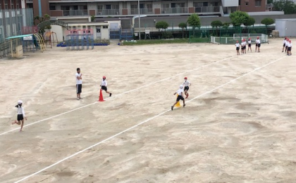 運動場を斜めに引いた線の真ん中にコーンが置いてあります。向かい合った子どもたちがコーン目指してスタートです。ビーチフラッグのような取り組みは、瞬発力を養うための準備運動だったようで、そのあと、子どもたちは50m走に入りました。