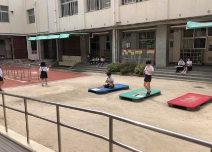 通常授業が再開されてから音楽の授業も再開しています。晴れ上がった今日は、密を避けて、みんなでリコーダーを持って教室から外に飛び出しました。本校の中庭は、クラスでまとまるにはちょうど良い広さのようです。