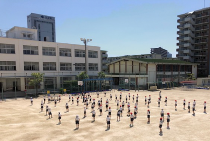 今日から6月。運動場は降り注ぐ太陽の光でまぶしい限りです。2時間目は、2年1組2組の体育の時間です。