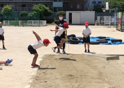 今度は立ち幅跳びに挑戦です。自分の立っているところから、大きく手を振って、ポンと砂場に飛び込みます。順番に並んで測定しました。