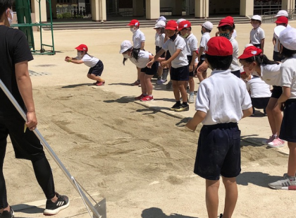 広がって準備運動をしたあと、1組さんは砂場の前に集合しました。