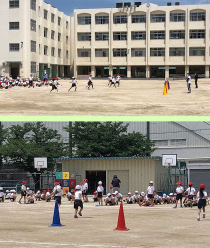 2時間目。1年1組と2組は運動場で体育の学習です。