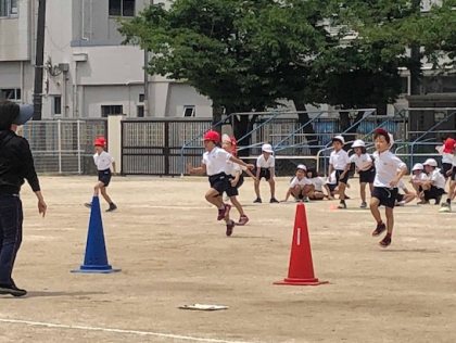 うさぎさんになったり、スキップしたり、いろいろな進み方でコーンを回りました。