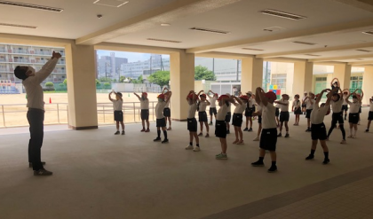 3時間目。ピロティから楽しそうな音楽が聞こえてきます。1年3組の体育の時間、教頭先生が子どもたちの準備運動に一役買ってくれたようです。