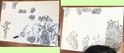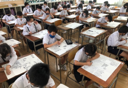 四つ切画用紙を机いっぱいに広げ、規則的なもようを描いている子どもたち。6等分に折って、一つのマスには、同じもようを描いていくようです。タケノコのようであったり、豆のツルのようであったり、波や渦を重ねてみたり、三角形をしきつめてみたり。