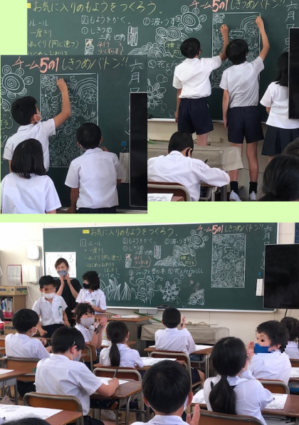 最後は黒板に、5の1しきつめバトンと名付け、みんなで頑張ってもようを描き込み、仕上げました。次の時間、その次の時間と、このもようがどんどん発展していく学習が待っているようです。