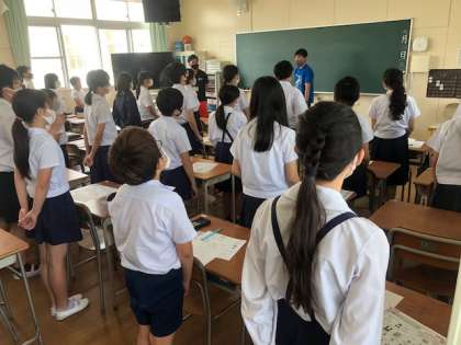 みんな立って、英語であいさつです。