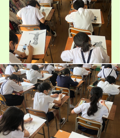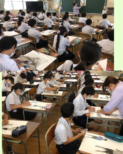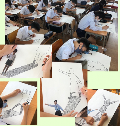 1時間目。6年3組は図工の時間です。画用紙に自分の、立ち姿を貼り、その後ろになるあたりにその立ち姿の拡大コピーを貼り、線で結んで影を表現したのが前回でした。