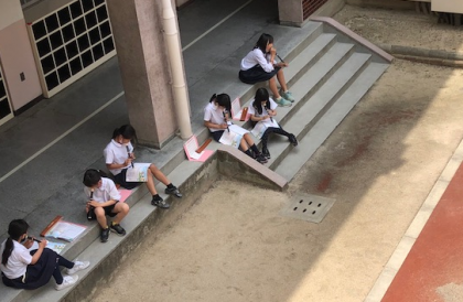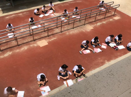 ピロティからかなと見ると、中庭で子どもたちが思い思いに座り、笛の練習をしていました。4年1組です。