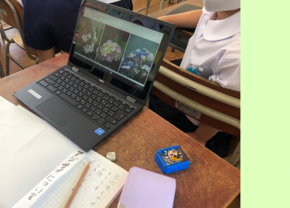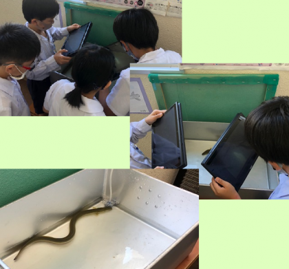 一人の画面は、とてもきれいなアジサイの花が並んでいました。教室の外では、廊下にある何かをタブレットを使って写真を撮っています。見ると、ウナギ。
