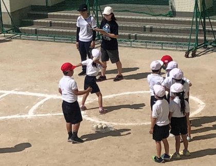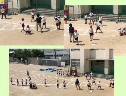 まだ、投げ方もおぼつかない1年生。力み過ぎて、すぐ前の地面にボールをたたきつけてしまう事もしばしばです。線の向こうの方は、縁のない領域のようですね。