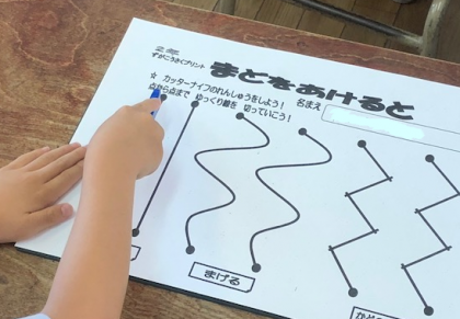 今日は、初めてカッターナイフを使うことになるので、思うように線の上を切ることができるように練習をしました。