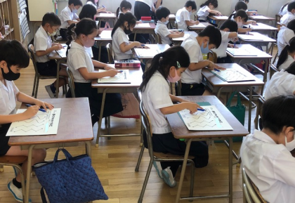 子どもたちの机の上には、何やら面白い形状の線が引かれた画用紙が置かれています。