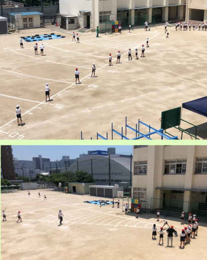 3時間目と4時間目。4年生がソフトボール投げをしました。球拾いのために位置についた子どもたちの広がり方が、1年生と違うのが歴然としています。