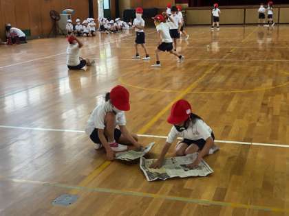 音は、待っている方のグループの子どもたちからです。以前の活動で、新聞紙を丸めたりたたんだりして形を作りましたが、それを今日、投げたり走って捕まえたりしてしているのでした。