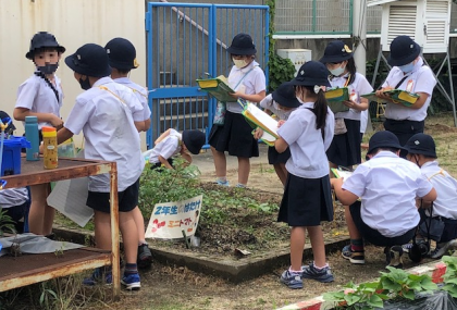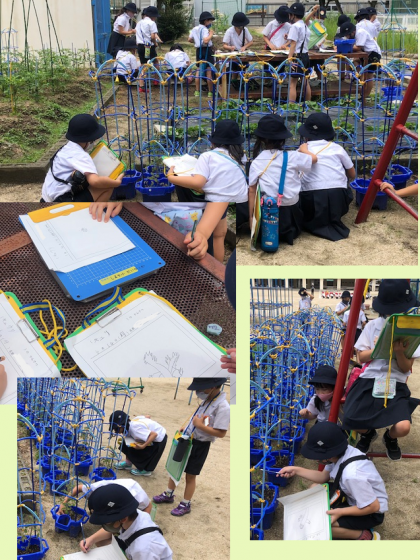 3時間目。2年3組が学習園まで足を運び、トマトやサツマイモやキュウリなど、自分たちの植えた作物について観察しました。