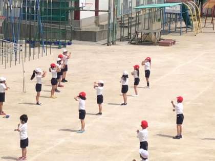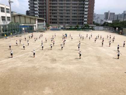 5時間目。じりじりと暑くなってきた運動場で活動しているのは、3年3組と4組です。運動場いっぱいに広がって、準備運動をしていました。