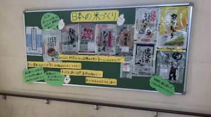 5年生の階段踊り場の掲示板には、この米の学習のことが解説されています。授業を受けて、この掲示物を見て、とすることで、お米の学習が一層楽しくなりそうです。