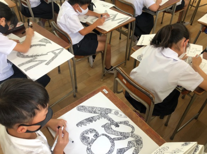 よく見るとアルファベット。それを飾り文字にして文字の中にきれいな線を描いています。慎重に描くときは息を止めているのかな、と思うくらい繊細な仕事をしている児童もいます。できあがりはどんなになるのかな。