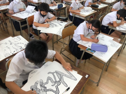静かに子どもたちが打ち込んでいるのは線描です。先日いろんなもようを描いてみてしっかり練習した後、この制作につながっているようです。