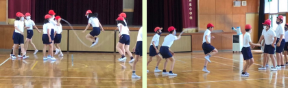 グループに分かれて、その中の二人が回し手になり、次々に他の子どもたちが回る縄を跳んでいきます。最初は0の字を書くように。