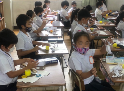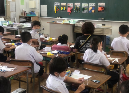 子どもたちが、苦心して何かを作っています。黒板に貼り付けられているのは見本になる折り方らしく、子どもたちはその形をめざして、紙を折っているのでした。折り方にも名前を付けていて、いろいろ組み合わせると、さらに、いろいろな形が出来上がります。