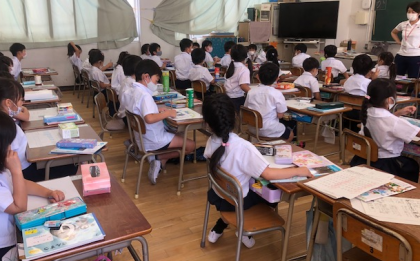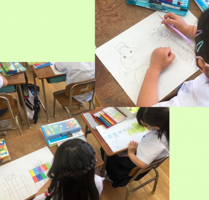 3時間目。1年1組の教室です。子どもたちの机の上にはそれぞれお気に入りの箱があって、その箱のかたちから想像できるものを絵にしているようでした。