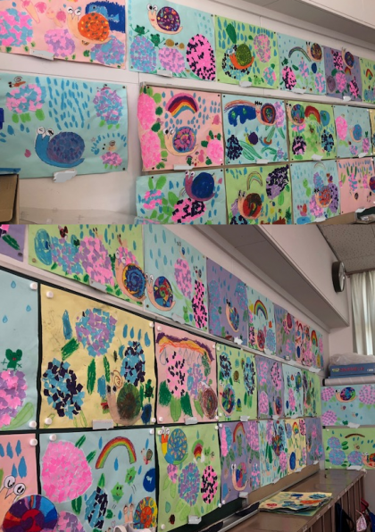 1組の教室も、先日仕上げたあじさいの絵が、後ろの壁に所狭しと飾られていました。キラキラ生き生きしていて、どれも素敵でした。