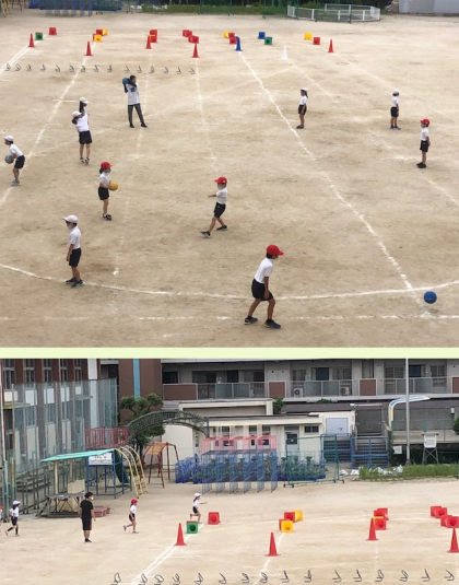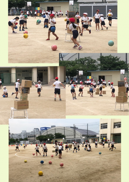 2組は、積み上げた段ボール箱を中心に円を描き、そこから段ボールめがけてボール投げをしました。