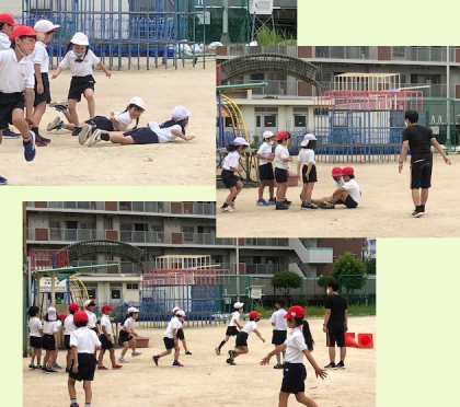 1組は、コーンを置いてかけっこです。最初は普通にスタートしていましたが、伏せた状態からや、走る方向に背を向けて座った状態からのスタートが始まりました。