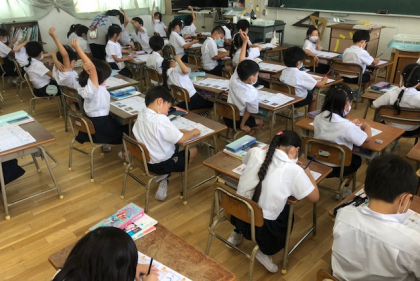 紙に印刷されたいろいろなかたちのものを分類するため、まず切り取ってかたちを確かめましょうと、はさみを入れていました。