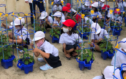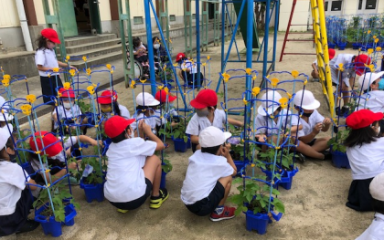 4時間目。1年1組の子どもたちは、教室を出て、先日支柱を立てたあさがおの応援に行きました。