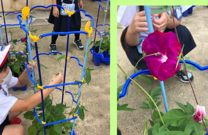 よく見てみてね、しっかりーって応援してね、と先生から言われ、子どもたちは、元気にツルを伸ばしたあさがおを、お行儀よく、支柱に巻いてあげたり、声をかけたり。