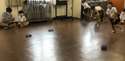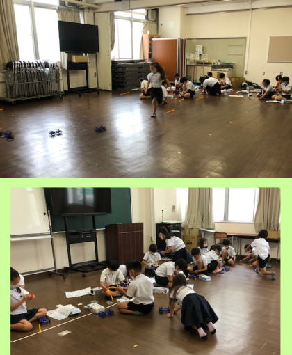 理科の学習で、ゴムで動く車を作り、それを動かそうということで床のきれいな多目的室で活動することになりました。