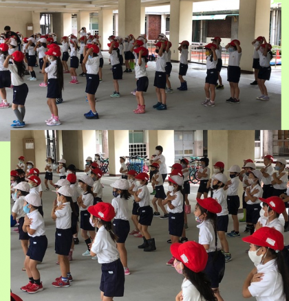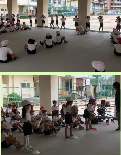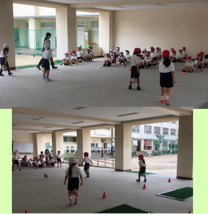 雨がよく降る3時間目。1年1組と2組の体育は、ピロティで行うことになりました。