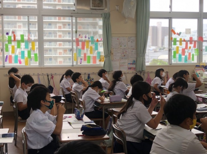 教室の外側の窓には、七夕の短冊でしょうか。色とりどりでとてもきれいです。