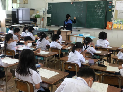 1年2組の教室です。「わ」と読むけれど、書けば「は」となる言葉について、先生から説明を聞く子どもたち。「はを使おう」の学習です。
