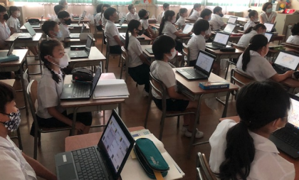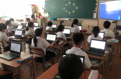4時間目。4年4組の教室では少し薄暗くしてDVDを見ていました。机上にはパソコンが広げられ、月齢カレンダーを見ていたようです。