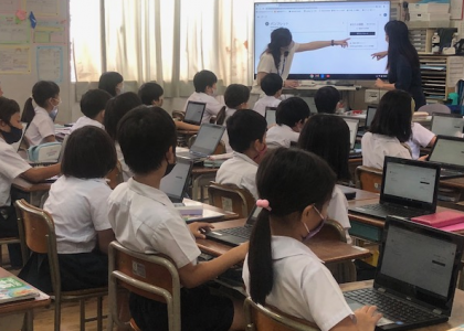 2時間目。3年1組では、きれいにパソコンが机の上に並んでいます。