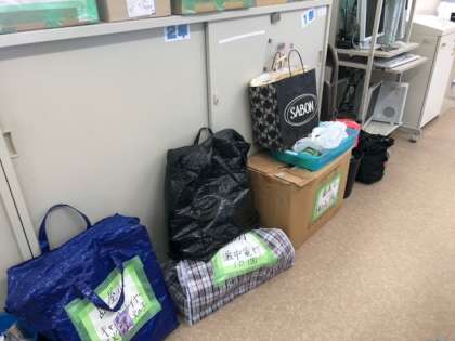 明日から林間学習です。学校では、5年生の先生を中心に、準備物の確認をして、職員室の一角にまとめられています。