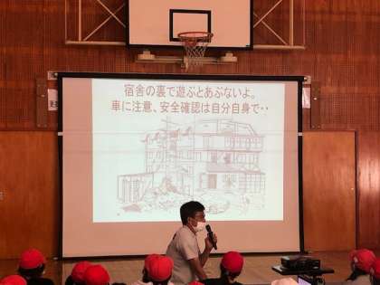 宿の方から、体育館で宿舎の使い方や屋外で気をつけることを教えていただきました。「マムシに注意!」などと都会では、考えられない注意もありました。