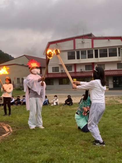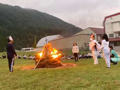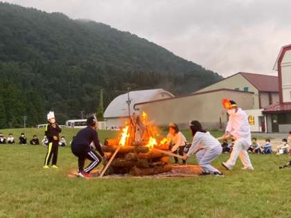 キャンプファイヤーが始まりました。火の神から聖なる火授かり、高原に炎が灯りました。